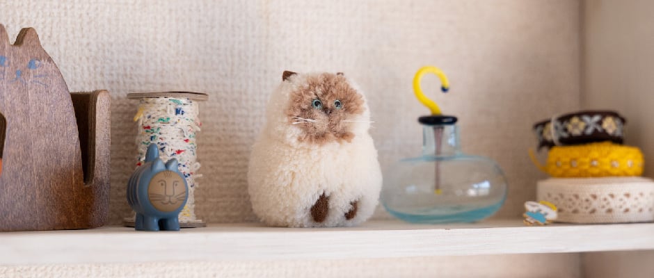 ゆったり香箱座り ローズマリーで染めた毛糸から生まれた、 手のひらサイズの小さなポンポン猫です。 植物のあたたかな色が動物の自然な彩りを引き出します。 サイズ:縦 約6cm 横 約6cm 奥行き 約11cm(しっぽ含む) 素材:草木染めウール(鉄媒染) 観賞用としてお楽しみください。 こちらはご注文後に制作する作品です。 染色からひとつひとつ手作業で制作しているため、表情や形、色味には個体差があります。掲載している写真は見本品のため実際にお届けする作品と細部が異なる場合があります。 ※7日以内に発送いたします。